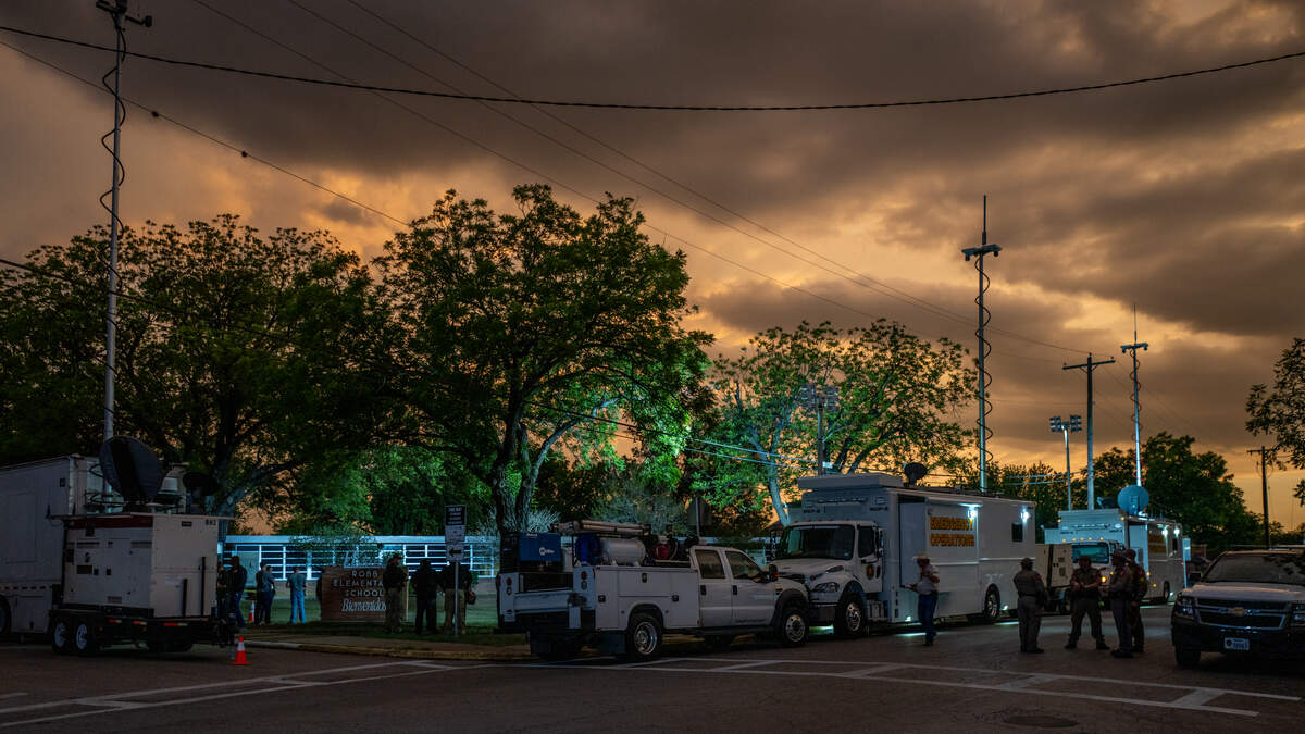 UVALDE, TEXAS - MAY 24: Law enforcement officers gather outside of Robb Elementary School following the mass shooting at Robb Elementary School on May 24, 2022 in Uvalde, Texas. According to reports, 19 students and 2 adults were killed, with the gunman fatally shot by law enforcement. (Photo by Brandon Bell/Getty Images)