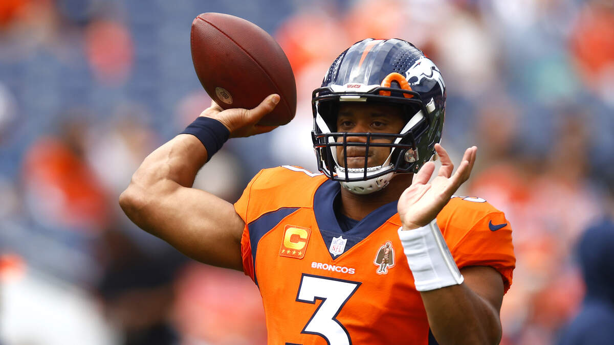 DENVER, COLORADO - SEPTEMBER 10: Russell Wilson #3 of the Denver Broncos warms-up prior to a game against the Las Vegas Raiders at Empower Field At Mile High on September 10, 2023 in Denver, Colorado. (Photo by Justin Edmonds/Getty Images)