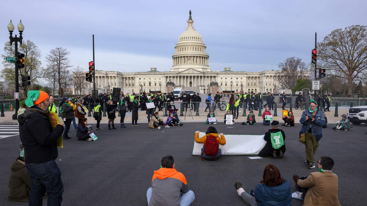 WASHINGTON, DC - MARCH 26: Demonstrators stage a sit-in at the US Capitol during the "Bans Off Our Mifepristone" action organized by the Woman's March on March 26, 2024 in Washington, DC. (Photo by Jemal Countess/Getty Images for Women's March)
