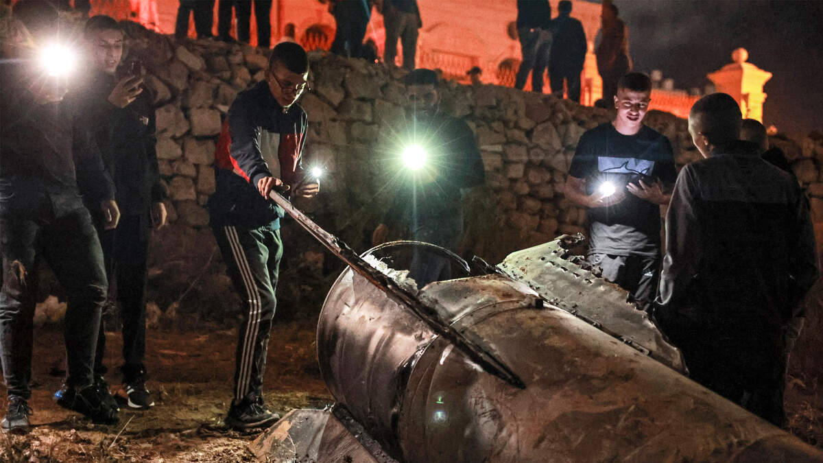Palestinian youths inspect a fallen projectile after Iran launched a barrage of missiles at Israel in response to the killings of Lebanese Hezbollah leader Nasrallah and other Iran-backed militants, in Ramallah in the occupied West Bank on October 1, 2024. Reports said Iran fired between 150 and 200 missiles in the attack, the country's second on Israel after a missile and drone attack in April in response to a deadly Israeli air strike on the Iranian consulate in Damascus. (Photo by Zain JAAFAR / AFP) (Photo by ZAIN JAAFAR/AFP via Getty Images)