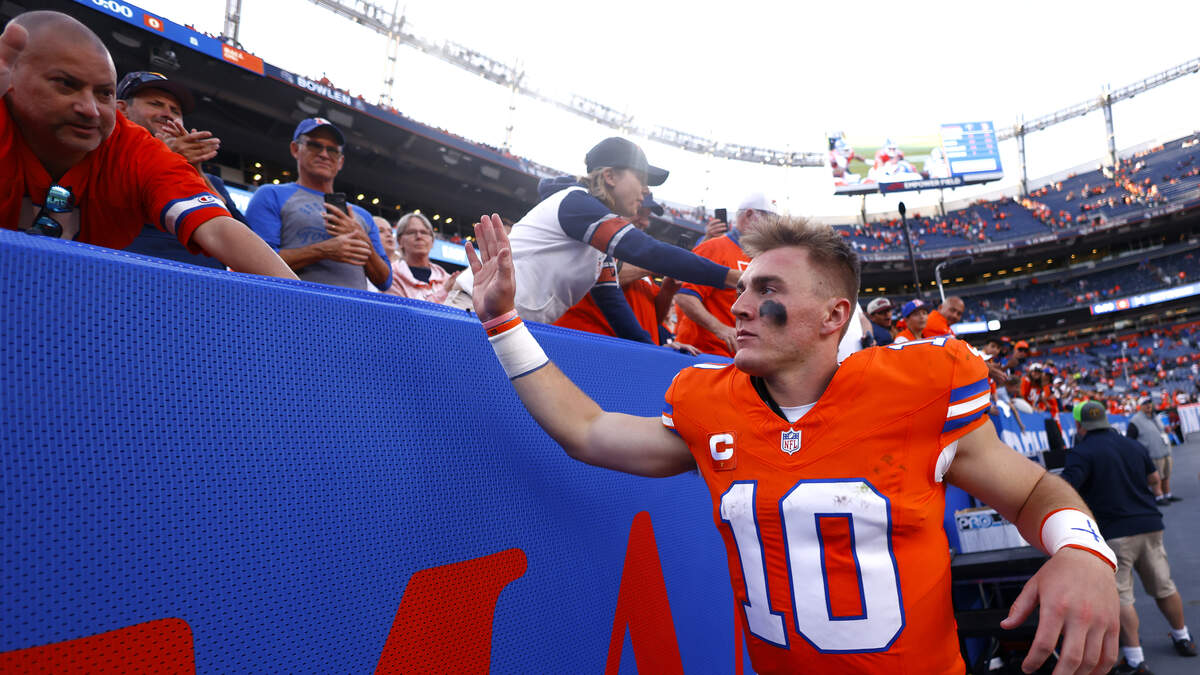 DENVER, COLORADO - OCTOBER 06: Bo Nix #10 of the Denver Broncos celebrates after defeating the Las Vegas Raiders at Empower Field At Mile High on October 06, 2024 in Denver, Colorado. (Photo by Justin Edmonds/Getty Images)