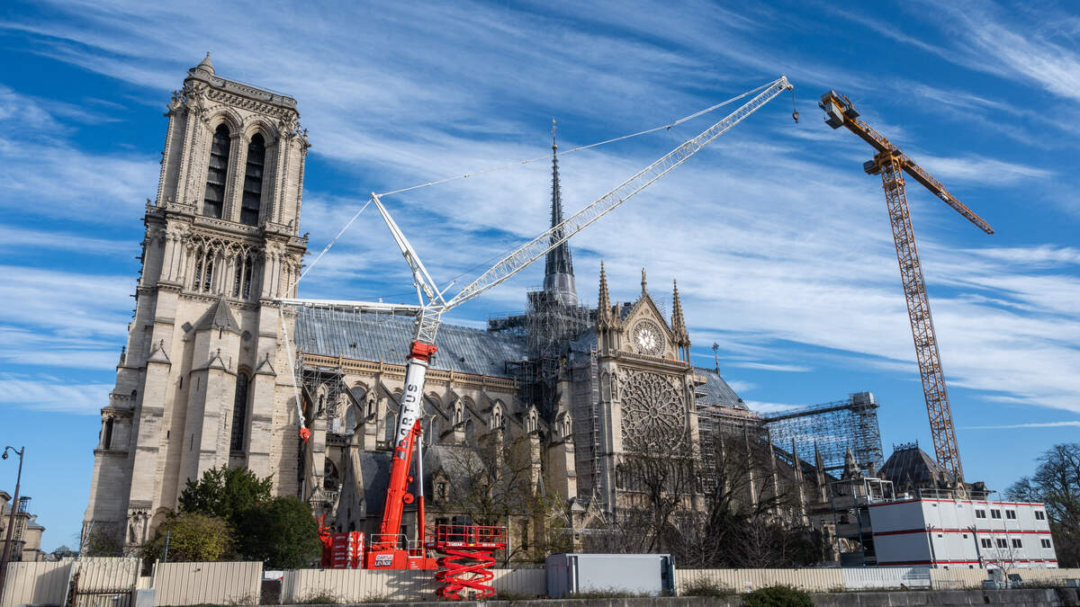 Notre Dame Cathedral in Paris undergoing renovation work in Paris, France, on December 6, 2024. More than five years after the fire in April 2019, Notre Dame Cathedral in Paris will once again welcome the world from December 7 and 8, 2024. Construction site and tourists. (Photo by Riccardo Milani / Hans Lucas / Hans Lucas via AFP) (Photo by RICCARDO MILANI/Hans Lucas/AFP via Getty Images)