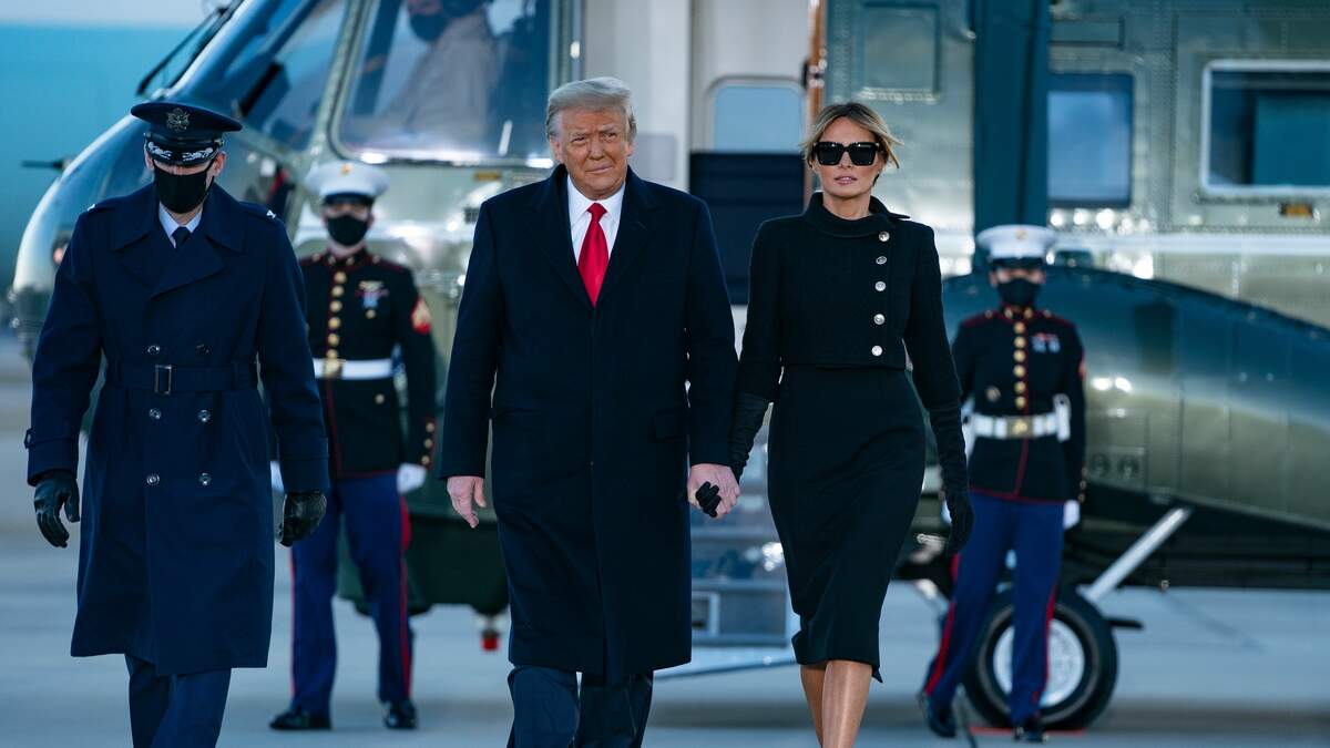 TOPSHOT - Outgoing US President Donald Trump and First Lady Melania Trump step out of Marine One at Joint Base Andrews in Maryland on January 20, 2021. - President Trump and the First Lady travel to their Mar-a-Lago golf club residence in Palm Beach, Florida, and will not attend the inauguration for President-elect Joe Biden. (Photo by ALEX EDELMAN / AFP) (Photo by ALEX EDELMAN/AFP via Getty Images)