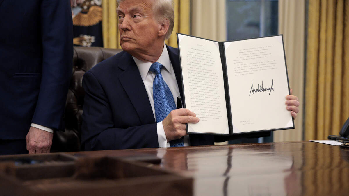 WASHINGTON, DC - JANUARY 31: U.S. President Donald Trump hold up an executive order, "Unleashing prosperity through deregulation," that he signed in the Oval Office on January 31, 2025 in Washington, DC. Trump spoke to reporters about tariffs against China, Canada and Mexico and how the newly confirmed Interior Secretary Doug Burghum will coordinate with the Energy Department and the Environmental Protection Agency. (Photo by Chip Somodevilla/Getty Images)