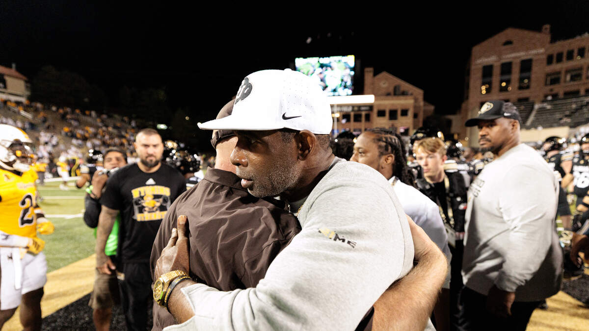 BOULDER, COLORADO - SEPTEMBER 20: Head coach Jay Sawvel of the Wyoming Cowboys and Head coach Deion Sanders of the Colorado Buffaloes talk after the game at Folsom Field on September 20, 2025 in Boulder, Colorado. (Photo by Andrew Wevers/Getty Images)