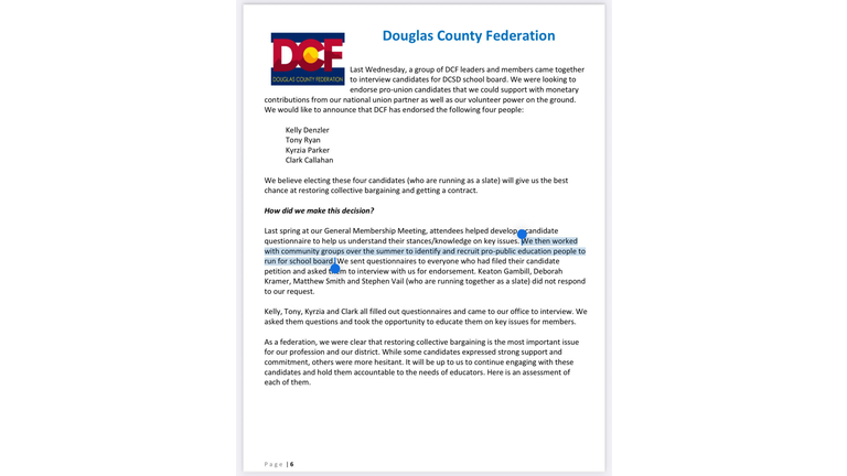 This is probably news to the Douglas County Federation, the teachers union that is fighting to bring back a collective bargaining agreement the district did away with years ago. They sent this letter out.