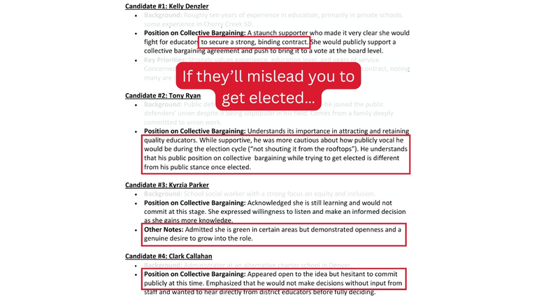 Hmmm, weird. Did the union pick these candidates? They seem to be taking credit there, don't they? But that's not all! The American Federation of Teachers sent out a big letter with better information about whether or not these candidates would vote to bring back the obviously unneeded CBA. Here is a key excerpt:
