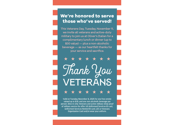 VETERANS, GET YOUR FREE MEAL TODAY Here is that list of 40 chain restaurants giving you free food, but local joint Oliver's, which is an outstanding Italian restaurant in the Tech Center, has got you too.