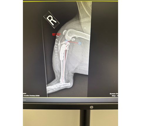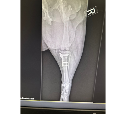 1 of 3 X-ray of Agnes' right leg with the TPLO plate and screws installed