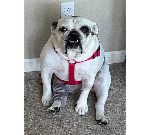 Here are a few pictures...two x-rays of her leg after the surgery and one of Agnes a few days after recovery wearing a "leg sleeve" to prevent her from licking or biting the incision/sutures/staples.