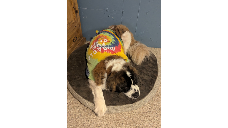 MY DOG THINKS SHE'S A PERSON NOW My Saint Bernard Jinx had to have some surgery last week so to protect her sutures, we put a shirt on her. We had to change her shirt yesterday and she got MAD when we took her shirt off. This is today.