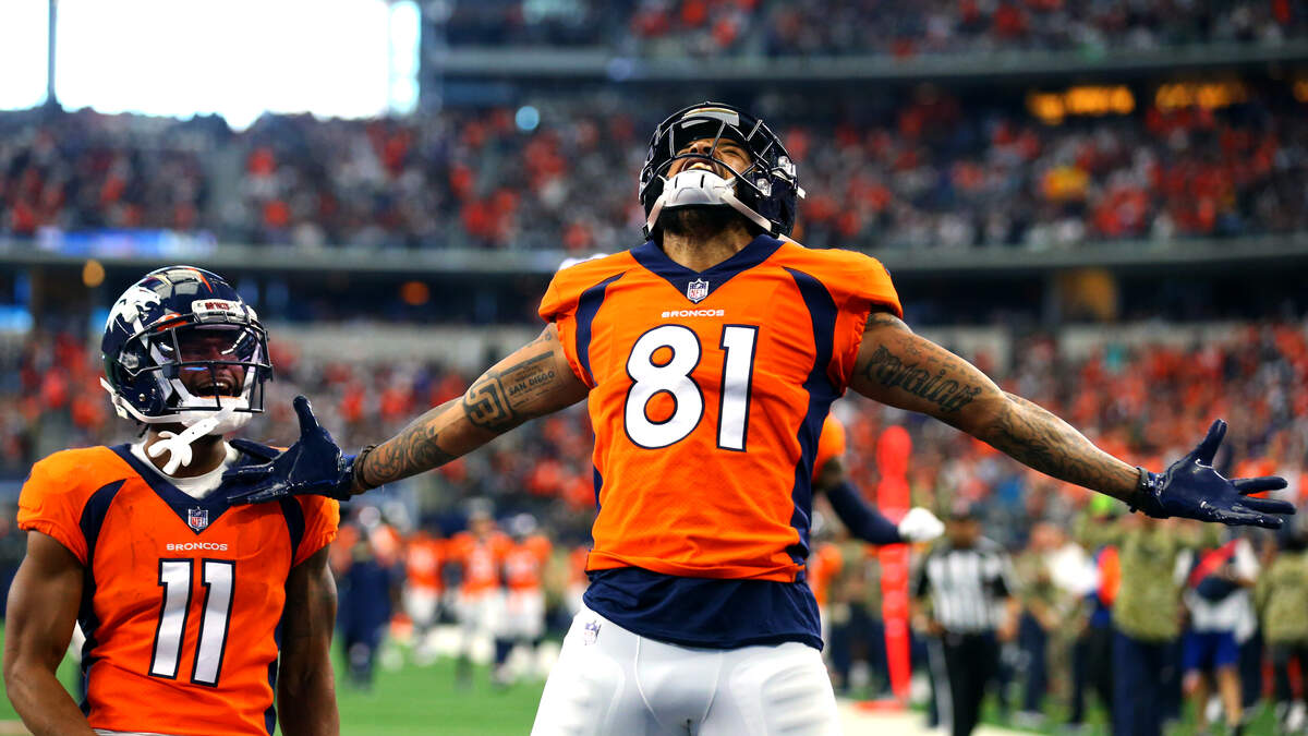 ARLINGTON, TEXAS - NOVEMBER 07: Tim Patrick #81 of the Denver Broncos celebrates after catching the ball for a touchdown during the second quarter against the Dallas Cowboys at AT&T Stadium on November 07, 2021 in Arlington, Texas. (Photo by Richard Rodriguez/Getty Images)Photo: Getty Images