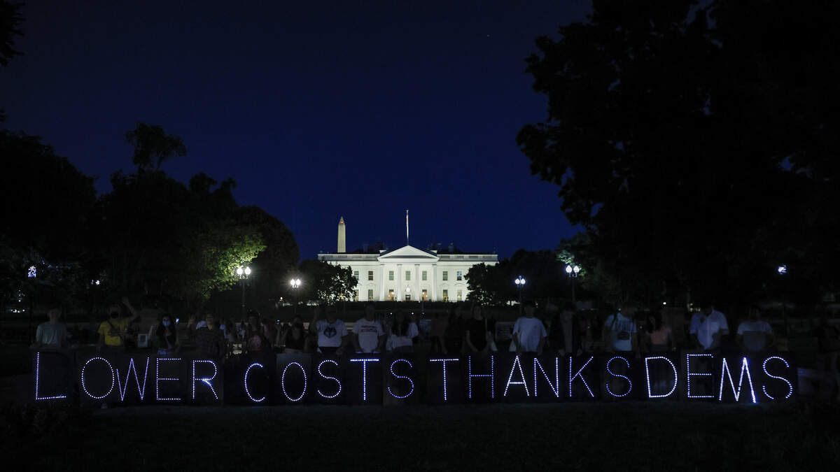 WASHINGTON, DC - AUGUST 12: A light panel display thanking democrats for the passage of the Inflation Reduction Act is displayed in front of the White House on August 12, 2022 in Washington, DC. (Photo by Jemal Countess/Getty Images for DNC)Photo: Getty Images