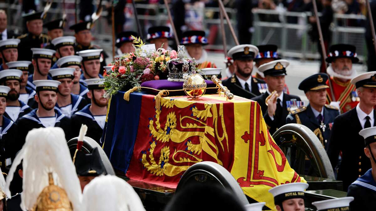 The coffin of Queen Elizabeth II, is accompanied by Royal Navy sailors on September 19, 2022, making its final journey to Windsor Castle in London after the State Funeral Service of Britain's Queen Elizabeth II. (Photo by ALKIS KONSTANTINIDIS / POOL / AFP) (Photo by ALKIS KONSTANTINIDIS/POOL/AFP via Getty Images)Photo: Getty Images