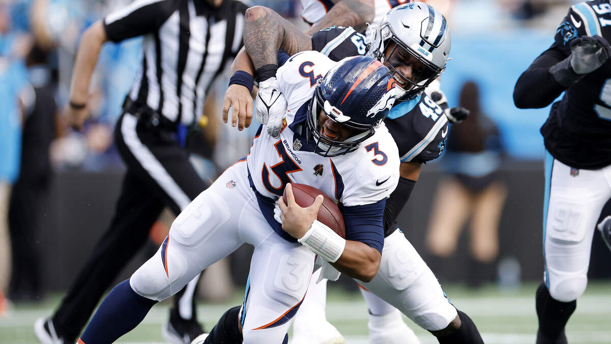 Frankie Luvu of the Carolina Panthers sacks Denver Broncos quarterback Russell Wilson in the fourth quarter of the Panthers 23-10 win on Sunday, November 27 at Bank of America Stadium in Charlotte, North Carolina. (Photo: Jared C. Tilton/Getty Images)Photo: Getty Images