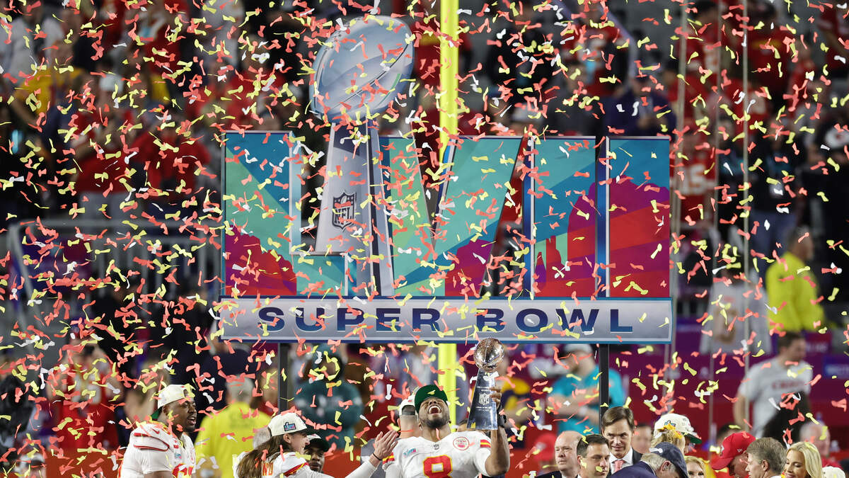 GLENDALE, ARIZONA - FEBRUARY 12: Carlos Dunlap #8 and Tommy Townsend #5 of the Kansas City Chiefs celebrate with The Vince Lombardi Trophy after defeating the Philadelphia Eagles 38 to 35 in Super Bowl LVII at State Farm Stadium on February 12, 2023 in Glendale, Arizona. (Photo by Carmen Mandato/Getty Images)Photo: Getty Images