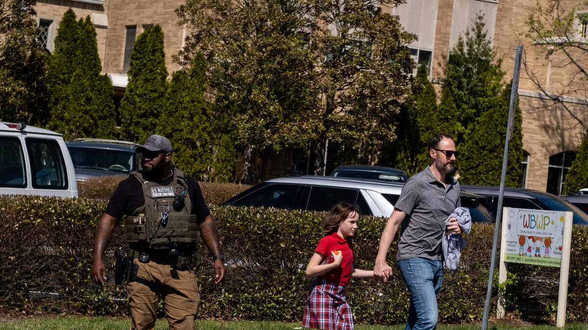 NASHVILLE, TN - MARCH 27: A parent walks with their child from Woodmont Baptist Church where children were reunited with their families after a mass shooting at The Covenant School on March 27, 2023 in Nashville, Tennessee. According to initial reports, three students and three adults were killed by the shooter, a 28-year-old woman. The shooter was killed by police responding to the scene. (Photo by Seth Herald/Getty Images)Photo: Getty Images
