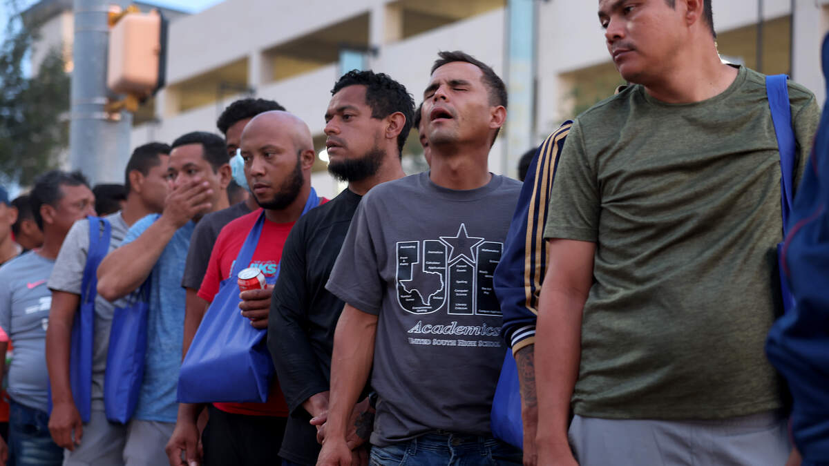 BROWNSVILLE, TEXAS - MAY 10: Migrants, mostly from Venezuela, pray together as wait for food outside of the bus stop after being processed by the U.S. Border Patrol following crossing the border from Mexico on May 10, 2023 in Brownsville, Texas. A surge of immigrants is expected with the end of the U.S. government's Covid-era Title 42 policy, which for the past three years has allowed for the quick expulsion of irregular migrants entering the country. More than 29,000 individuals are in U.S. Customs and Border Protection custody, including nearly 18,000 in the last 24 hours. (Photo by Joe Raedle/Getty Images)Photo: Getty Images