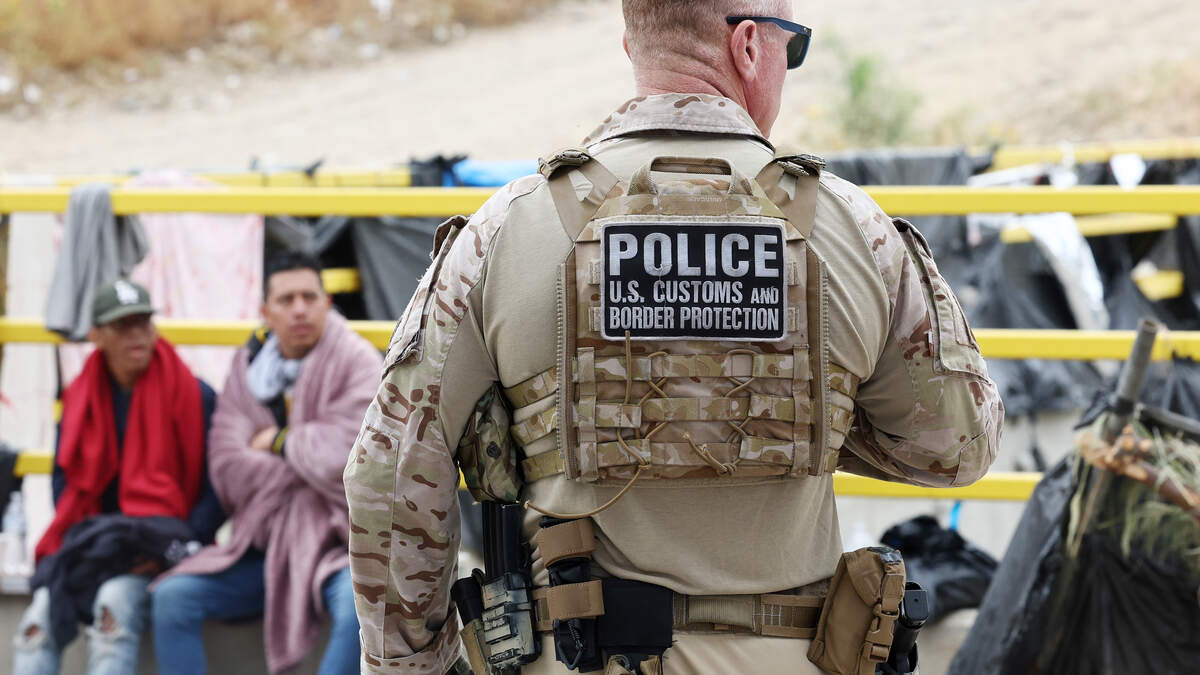 SAN DIEGO, CALIFORNIA - MAY 13: A Customs and Border Protection officer keeps watch as immigrants are transported from a makeshift camp between border walls between the U.S. and Mexico on May 13, 2023 in San Diego, California. Some of the immigrants at the open air camp have been waiting for days in limbo for a chance to plead for asylum while local volunteer groups are providing food and other necessities. The U.S. government's Covid-era Title 42 policy, which for the past three years had allowed for the quick expulsion of irregular migrants entering the country, expired on the evening of May 11. (Photo by Mario Tama/Getty Images)Photo: Getty Images