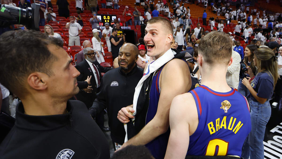 MIAMI, FLORIDA - JUNE 07: Nikola Jokic #15 of the Denver Nuggets reacts after a 109-94 victory against the Miami Heat in Game Three of the 2023 NBA Finals at Kaseya Center on June 07, 2023 in Miami, Florida. NOTE TO USER: User expressly acknowledges and agrees that, by downloading and or using this photograph, User is consenting to the terms and conditions of the Getty Images License Agreement. (Photo by Mike Ehrmann/Getty Images)Photo: Getty Images