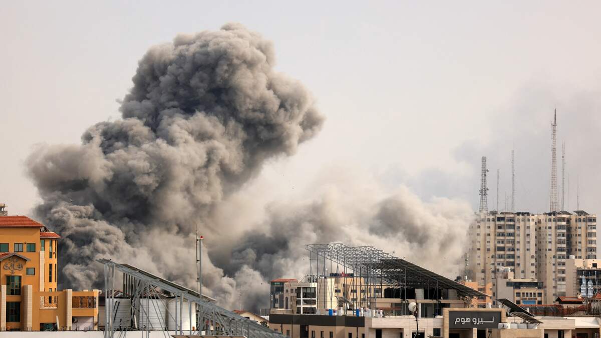 A plume of smoke billows behind highrise buildings in the sky during an Israeli airstrike on Gaza City on October 9, 2023. Israel relentlessly pounded the Gaza Strip overnight and into October 9 as fighting with Hamas continued around the Gaza Strip, as the death toll from the war against the Palestinian militants surged above 1,100. (Photo by MAHMUD HAMS / AFP) (Photo by MAHMUD HAMS/AFP via Getty Images)Photo: MAHMUD HAMS / AFP / Getty Images