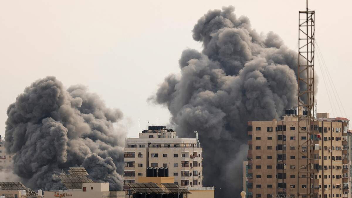 A black plume of smoke billows behind highrise buildings in the sky during an Israeli airstrike on Gaza City on October 9, 2023. Israel relentlessly pounded the Gaza Strip overnight and into October 9 as fighting with Hamas continued around the Gaza Strip, as the death toll from the war against the Palestinian militants surged above 1,100. (Photo by MAHMUD HAMS / AFP) (Photo by MAHMUD HAMS/AFP via Getty Images)Photo: MAHMUD HAMS / AFP / Getty Images