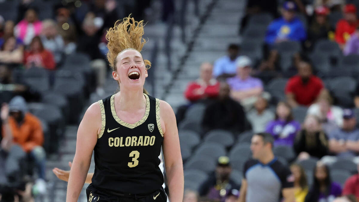 LAS VEGAS, NEVADA - NOVEMBER 06: Frida Formann #3 of the Colorado Buffaloes reacts after hitting a 3-pointer against the LSU Lady Tigers in the second half of their game during the Naismith Basketball Hall of Fame Series at T-Mobile Arena on November 06, 2023 in Las Vegas, Nevada. The Buffaloes defeated the Lady Tigers 92-78. (Photo by Ethan Miller/Getty Images)Photo: Ethan Miller / Getty Images Sport / Getty Images
