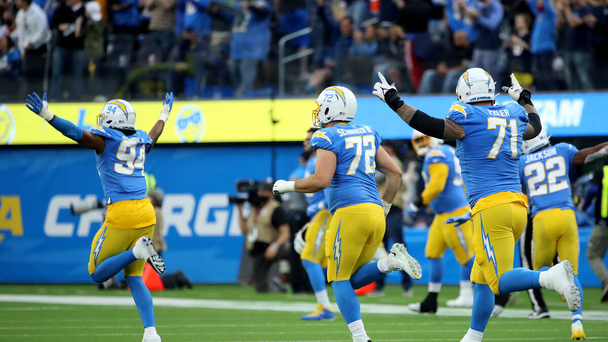 INGLEWOOD, CALIFORNIA - JANUARY 02: Chris Rumph II #94, Michael Schofield #72 and Matt Feiler #71 of the Los Angeles Chargers celebrate after Andre Roberts #7 (not pictured) returned a kick-off for a 101-yard touchdown in the fourth quarter of the game against the Denver Broncos at SoFi Stadium on January 02, 2022 in Inglewood, California. (Photo by Katelyn Mulcahy/Getty Images)Photo: Getty Images