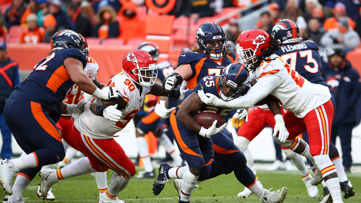 DENVER, COLORADO - JANUARY 08: Melvin Gordon #25 of the Denver Broncos rushes during the second half ahead of Jarran Reed #90 of the Kansas City Chiefs at Empower Field At Mile High on January 08, 2022 in Denver, Colorado. (Photo by Jamie Schwaberow/Getty Images)Photo: Getty Images