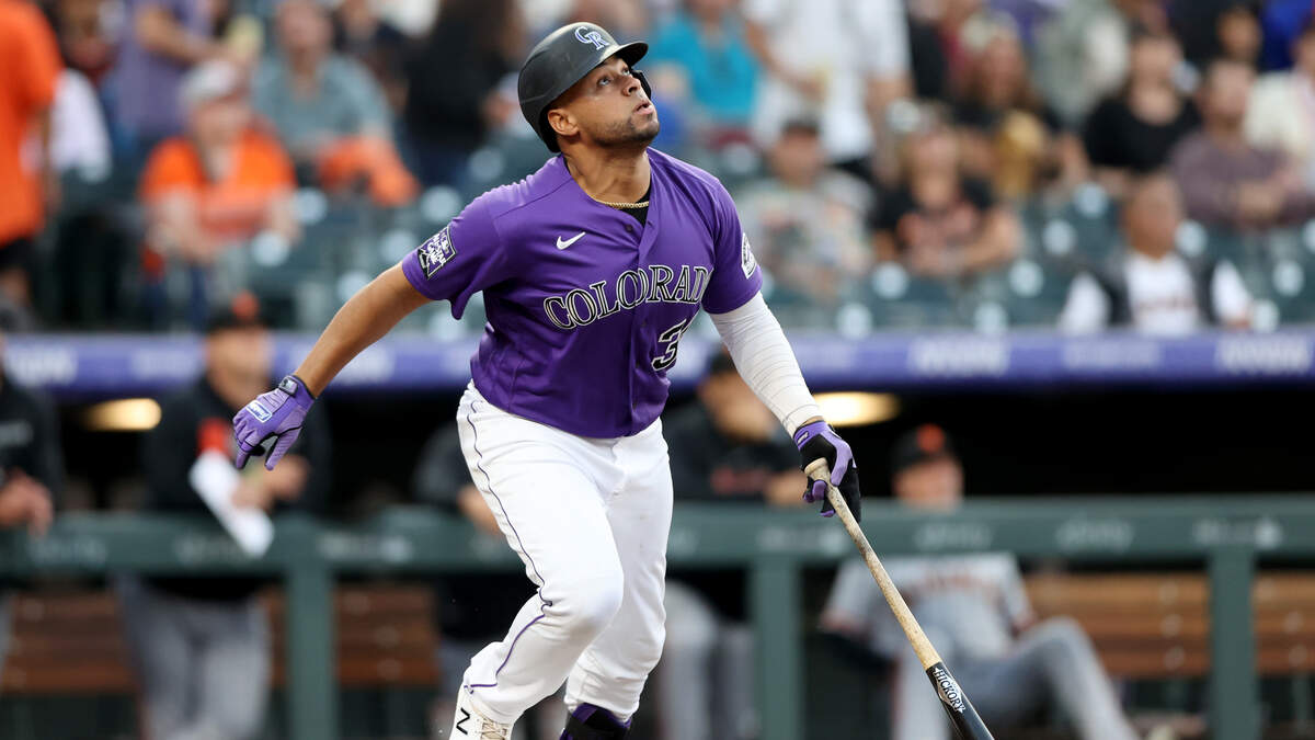 Colorado Rockies catcher Elias Diaz hits an RBI single against the San Francisco Giants at Coors Field on September 24, 2021. (Photo: Matthew Stockman/Getty Images)Photo: Getty Images