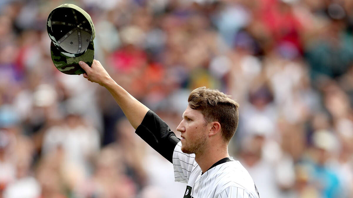 Rockies pitcher Kyle Freeland acknowledges the crowd as he leaves the game in the ninth inning of Sunday's 10-0 win over the Chicago White. - Photo: Matthew Stockman/Getty Images