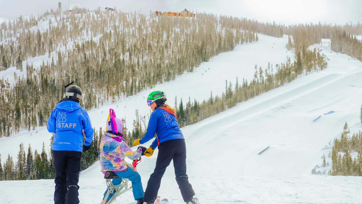 Winter Park, Colorado/USA - 01/24/2020: Two young women downhill skiers working for National Sport Center for Disabled helping disabled girl on 3-ski snow bike to ride down; ski slopes in backgroundPhoto: Getty Images