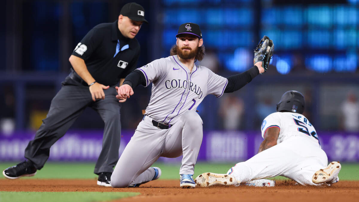 MIAMI, FLORIDA - MAY 02: Brendan Rodgers #7 of the Colorado Rockies catches the ball over Dane Myers #54 of the Miami Marlins during the fourth inning of the game at loanDepot park on May 02, 2024 in Miami, Florida. (Photo by Megan Briggs/Getty Images)Photo: Megan Briggs / Getty Images Sport / Getty Images