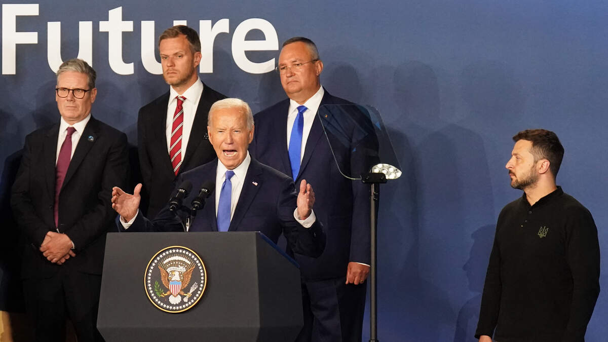 Ukraine's President Volodymyr Zelensky (R) listens as US President Joe Biden (C) speaks during the closing ceremony at the NATO 75th anniversary summit at the Walter E. Washington Convention Center in Washington, DC on July 11, 2024. (Photo by Stefan Rousseau / POOL / AFP) (Photo by STEFAN ROUSSEAU/POOL/AFP via Getty Images)Photo: STEFAN ROUSSEAU / AFP / Getty Images