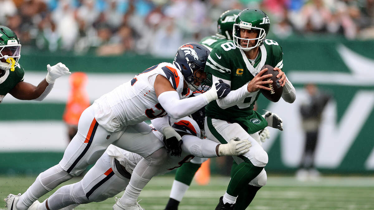 EAST RUTHERFORD, NEW JERSEY - SEPTEMBER 29: Aaron Rodgers #8 of the New York Jets is tackled by Jonah Elliss #52 and Malcolm Roach #97 of the Denver Broncos during the fourth quarter at MetLife Stadium on September 29, 2024 in East Rutherford, New Jersey. (Photo by Luke Hales/Getty Images)Photo: Luke Hales / Getty Images Sport / Getty Images