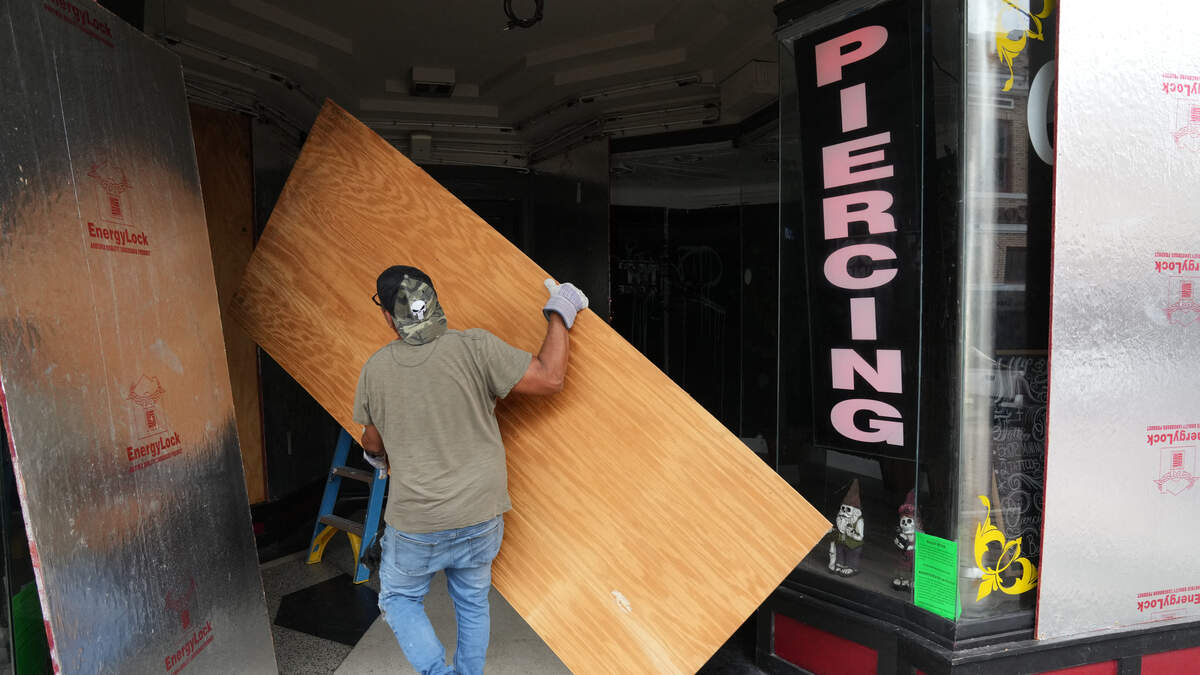 Contractors put plywood over windows at a tattoo and piercing parlor in the Ybor City section of Tampa ahead of Hurricane Milton's expected landfall in the middle of this week on October 8, 2024 in Florida. Hurricane Milton exploded in strength October 7 to become a potentially catastrophic Category 5 storm bound for Florida, threatening the US state with a second ferocious hurricane in as many weeks. (Photo by Bryan R. SMITH / AFP) (Photo by BRYAN R. SMITH/AFP via Getty Images)Photo: BRYAN R. SMITH / AFP / Getty Images