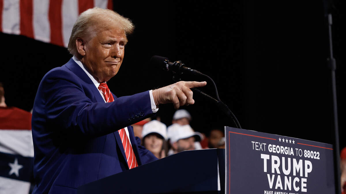 ATLANTA, GEORGIA - OCTOBER 15: Republican presidential nominee, former U.S. President Donald Trump gestures during a campaign rally at the Cobb Energy Performing Arts Centre on October 15, 2024 in Atlanta, Georgia. With early voting starting today in Georgia both Trump and Democratic presidential nominee, Vice President Kamala Harris are campaigning in the Atlanta region this week as polls show a tight race. (Photo by Kevin Dietsch/Getty Images)Photo: Kevin Dietsch / Getty Images News / Getty Images