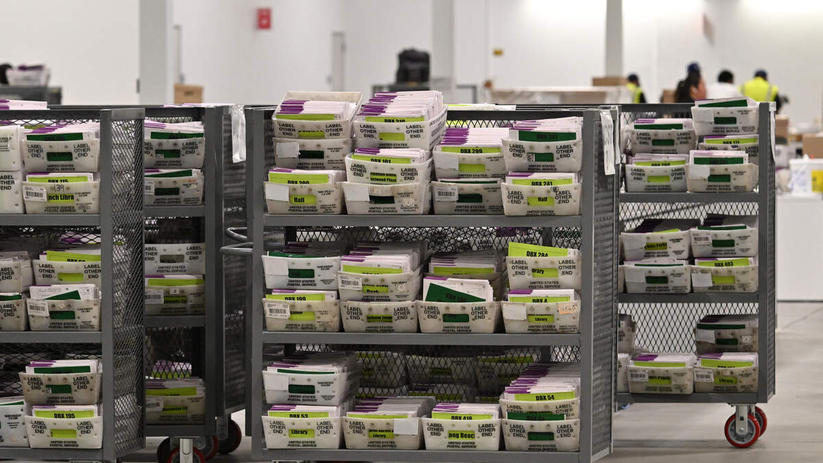 TOPSHOT - Mail-in ballots are lined up for processing at the Los Angeles County Ballot Processing Center on the eve of Election Day, November 4, 2024, in City of Industry, California. (Photo by Robyn Beck / AFP) (Photo by ROBYN BECK/AFP via Getty Images)Photo: ROBYN BECK / AFP / Getty Images