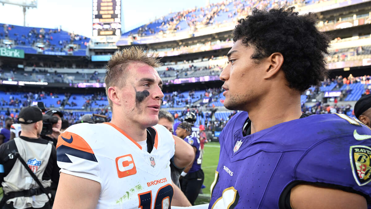 BALTIMORE, MARYLAND - NOVEMBER 03: Bo Nix #10 of the Denver Broncos and Kyle Hamilton #14 of the Baltimore Ravens meet at midfield after Baltimore's 41-10 win at M&T Bank Stadium on November 03, 2024 in Baltimore, Maryland. (Photo by Greg Fiume/Getty Images)Photo: Greg Fiume / Getty Images Sport / Getty Images
