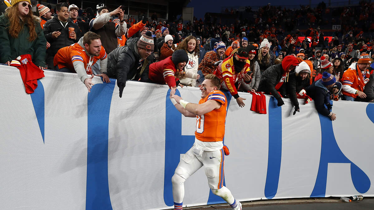 DENVER, COLORADO - JANUARY 05: Bo Nix #10 of the Denver Broncos celebrates with fans after beating the Kansas City Chiefs 38-0 at Empower Field At Mile High on January 05, 2025 in Denver, Colorado. (Photo by Justin Edmonds/Getty Images)Photo: Justin Edmonds / Getty Images Sport / Getty Images
