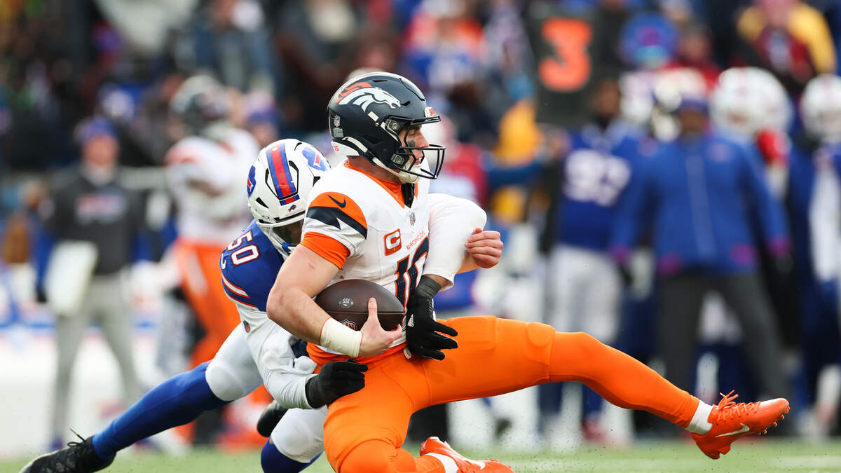 ORCHARD PARK, NEW YORK - JANUARY 12: Greg Rousseau #50 of the Buffalo Bills sacks Bo Nix #10 of the Denver Broncos in the fourth quarter during the AFC Wild Card Playoffs at Highmark Stadium on January 12, 2025 in Orchard Park, New York. (Photo by Elsa/Getty Images)Photo: Elsa / Getty Images Sport / Getty Images