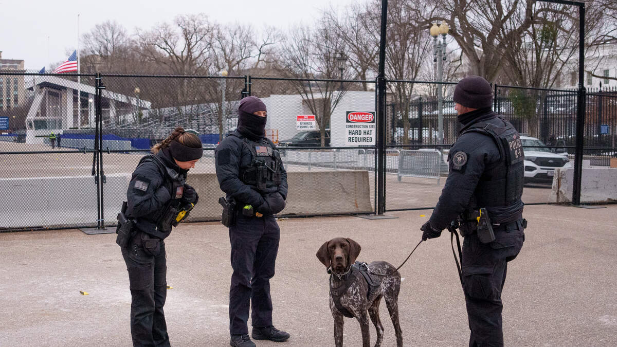 WASHINGTON, DC - JANUARY 16: Members of the U.S. Secret Service stand near the presidential Inauguration parade review stand (L) on Pennsylvania Avenue on the north side of the White House on January 16, 2025 in Washington, DC. U.S. President-elect Donald Trump and Vice President-elect Sen. JD Vance (R-OH) will be sworn in on January 20. Widespread road closures, parking restrictions and Metro service changes will take place. (Photo by Andrew Harnik/Getty Images)Photo: Andrew Harnik / Getty Images News / Getty Images