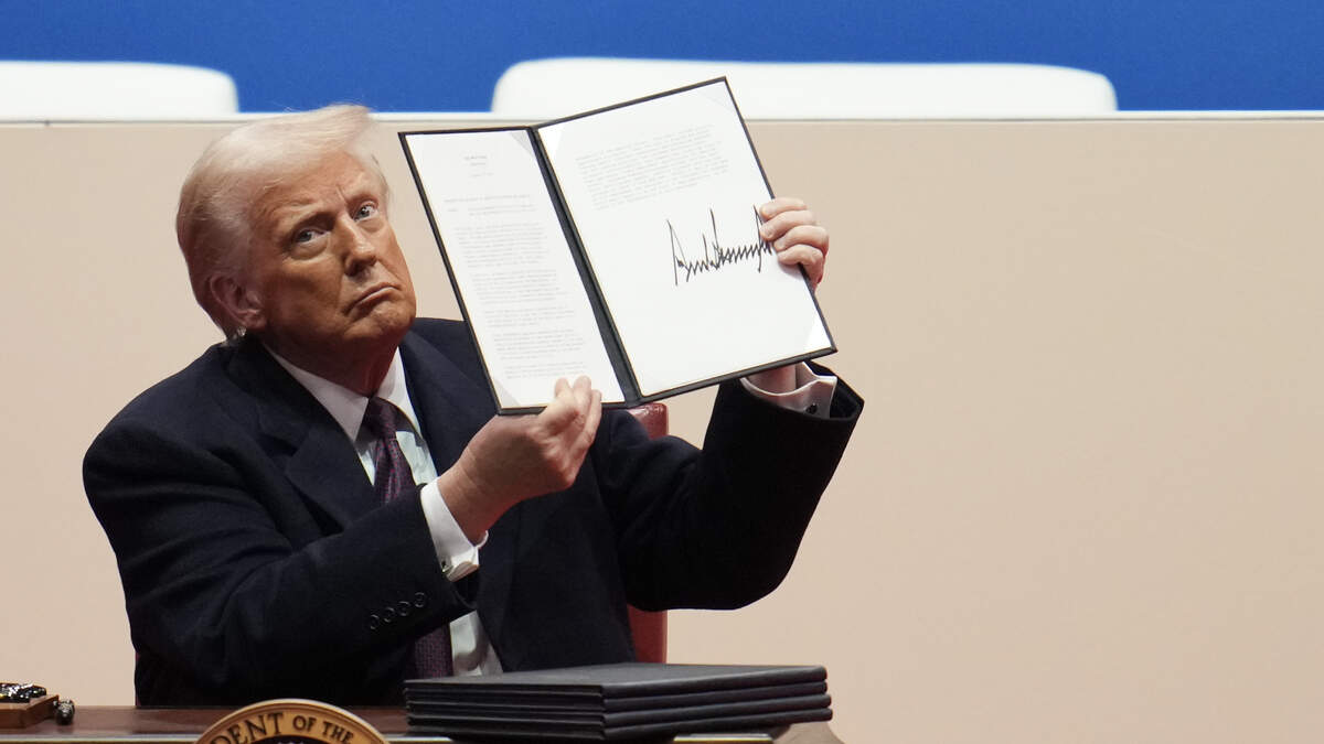 WASHINGTON, DC - JANUARY 20: U.S. President Donald Trump holds up an executive order after signing it during an indoor inauguration parade at Capital One Arena on January 20, 2025 in Washington, DC. Donald Trump takes office for his second term as the 47th president of the United States. (Photo by Christopher Furlong/Getty Images)Photo: Christopher Furlong / Getty Images News / Getty Images