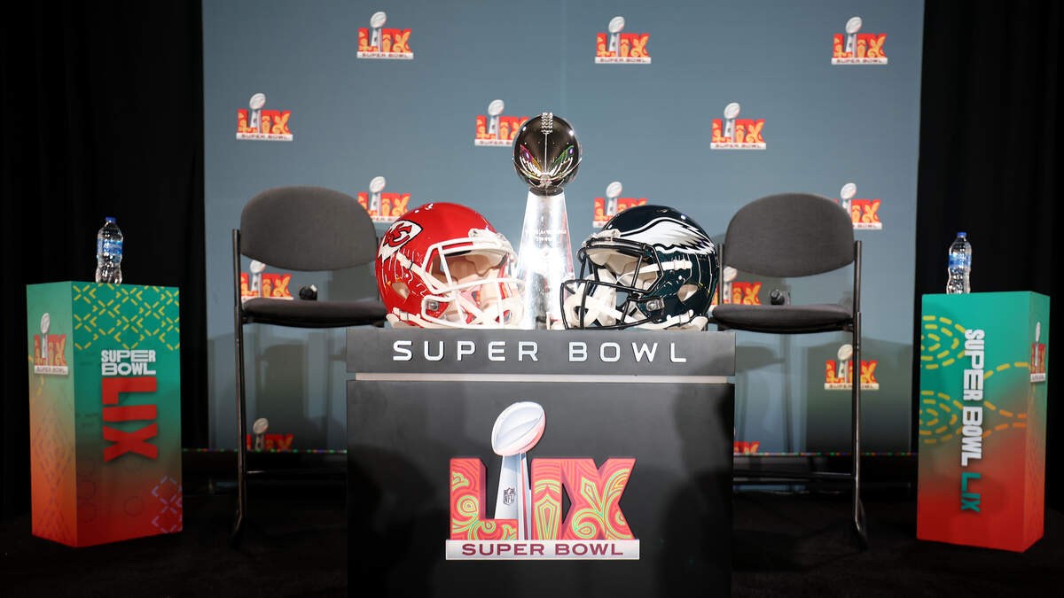 NEW ORLEANS, LOUISIANA - FEBRUARY 03: A Kansas City Chiefs helmet, the Vince Lombardi Trophy and a Philadelphia Eagles helmet are seen before the NFL Commissioner Roger Goodell's Super Bowl Press Conference ahead of Super Bowl LIX at Caesars Superdome on February 03, 2025 in New Orleans, Louisiana. (Photo by Chris Graythen/Getty Images)Photo: Chris Graythen / Getty Images Sport / Getty Images