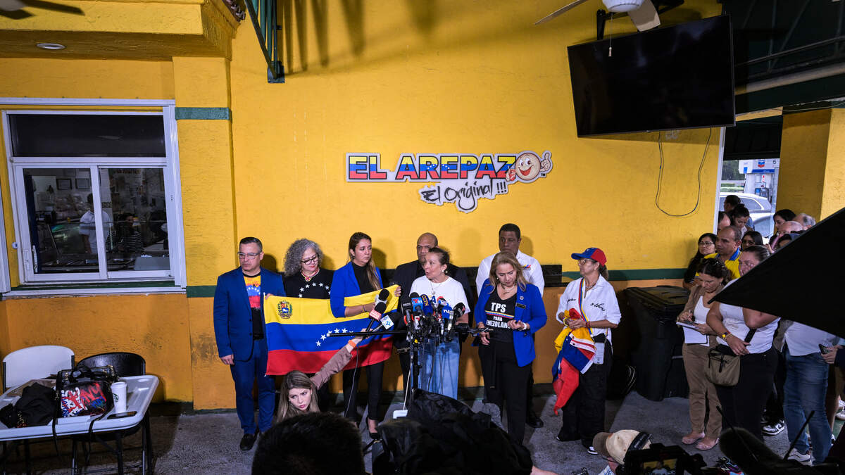 Venezuelan community leaders speak to the media as they protest against the suspension of Temporary Protected Status in Doral, Florida, on February 3, 2025. Trump administration is terminating an immigration program that currently protects hundreds of thousands of Venezuelan migrants in the US from deportation. (Photo by CHANDAN KHANNA / AFP) (Photo by CHANDAN KHANNA/AFP via Getty Images) Photo: CHANDAN KHANNA / AFP / Getty Images