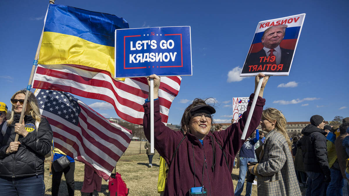 Protesters wave American and Ukrainian flags during a rally at the Ellipse in Washington, DC, on March 8, 2025. The "Don't Abandon Ukraine" rally calls on President Donald Trump to support Ukraine in the war against Russia. (Photo by Hanna Leka / Middle East Images / Middle East Images via AFP) (Photo by HANNA LEKA/Middle East Images/AFP via Getty Images) Photo: HANNA LEKA / AFP / Getty Images