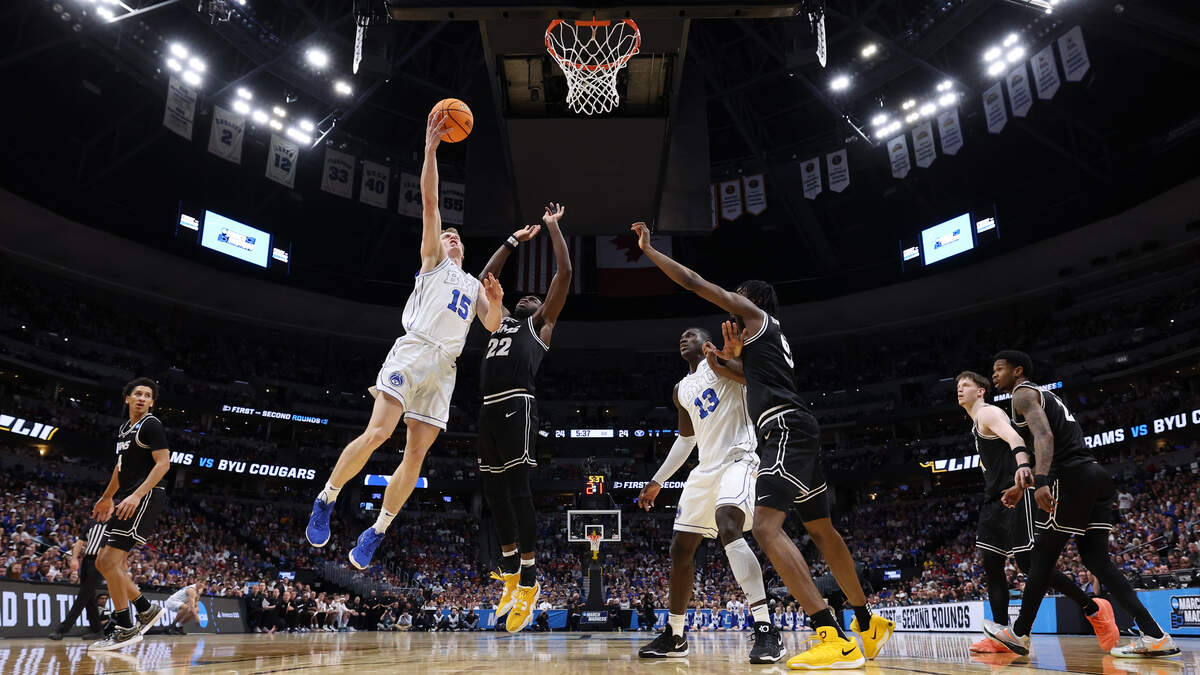 DENVER, COLORADO - MARCH 20: Richie Saunders #15 of the Brigham Young Cougars shoots the ball against Joe Bamisile #22 of the Virginia Commonwealth Rams during the first half in the first round of the NCAA Men's Basketball Tournament at Ball Arena on March 20, 2025 in Denver, Colorado. (Photo by Matthew Stockman/Getty Images)Photo: Matthew Stockman / Getty Images Sport / Getty Images