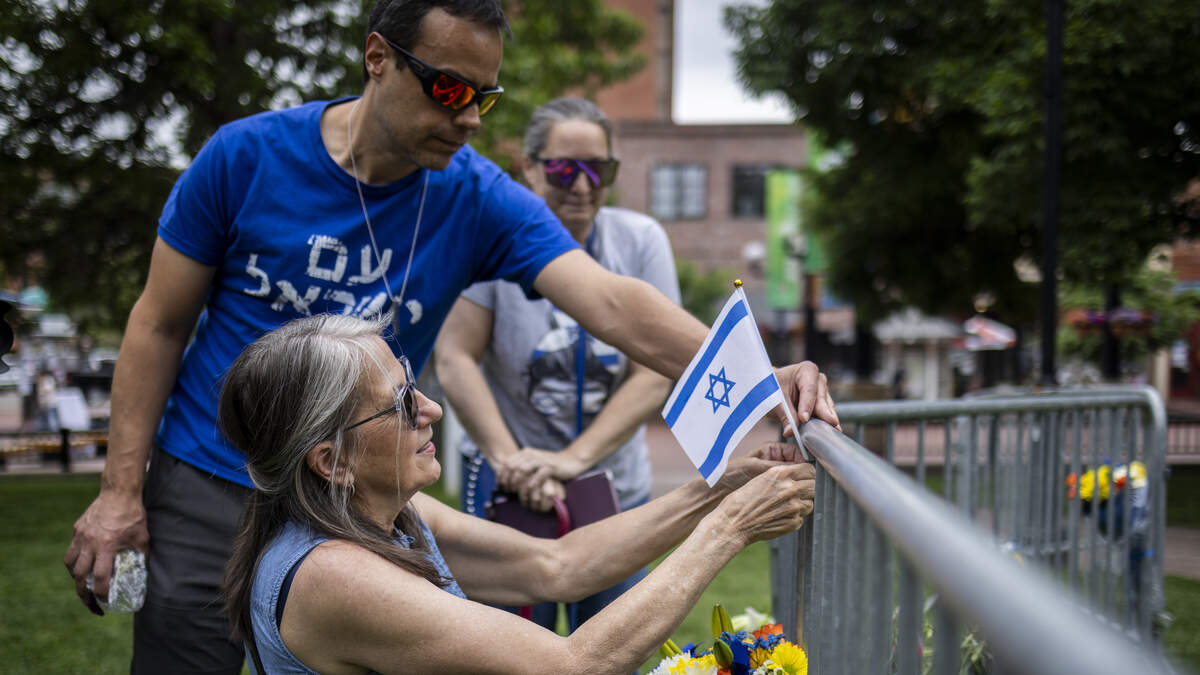 BOULDER, COLORADO - JUNE 2: Lisa Turnquist of Louisville, Colorado, lays flowers and a flag at the site of the attack outside the Boulder County Courthouse on June 2, 2025 in Boulder, Colorado. A suspect is in custody after reportedly throwing incendiary devices at a group participating in an organized walk to show solidarity with hostages held by Hamas in Gaza. The suspect, an Egyptian citizen who had overstayed his visa, has been charged with a hate crime by the F.B.I. (Photo by Chet Strange/Getty Images)Photo: Chet Strange / Getty Images News / Getty Images