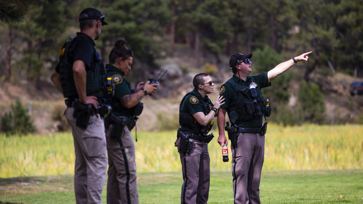 EVERGREEN, COLORADO - SEPTEMBER 10: Jefferson County Sheriff's officers watch as they fly a drone over the site of a shooting at Evergreen High School on September 10, 2025 in Evergreen, Colorado. At least three students, including the suspected shooter, were injured in the attack. (Photo by Michael Ciaglo/Getty Images)Photo: Michael Ciaglo / Getty Images News / Getty Images