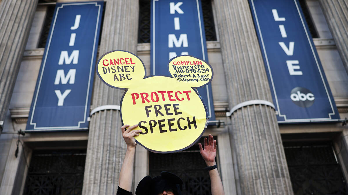 LOS ANGELES, CALIFORNIA - SEPTEMBER 22: A demonstrator waves a "Protect Free Speech" sign following a protest against the suspension of the "Jimmy Kimmel Live!" show, held near the theater where the show is produced in Hollywood, on September 22, 2025 in Los Angeles, California. A contingent of Hollywood union members, along with Democratic members of the House of Representatives, participated in the event "to defend Americans' constitutional right to free speech.” Kimmel's ABC late-night show has been "indefinitely" taken off the air following controversy over his comments about the killing of Charlie Kirk. (Photo by Mario Tama/Getty Images)Photo: Mario Tama / Getty Images News / Getty Images